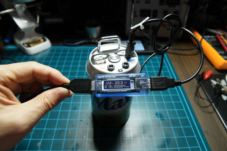 입출력에 USB to DC잭 형태로 만든 케이블을 제작하여 사진과 같이 전류량 측정이 가능하다.