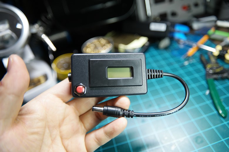 왼쪽 DC잭은 입력, 4.2V 충전기를 오른쪽 케이블은 충전할 기기에 열결하면 배터리 상태와 충전 전류 등을 측정할 수 있다.