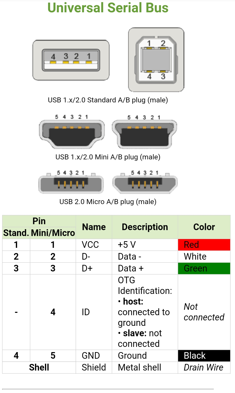 전원 플러스(VCC, 5V), 데이타 마이너스(Data -), 데이타 플러스(Data +), 전원 마이너스(Ground)인데