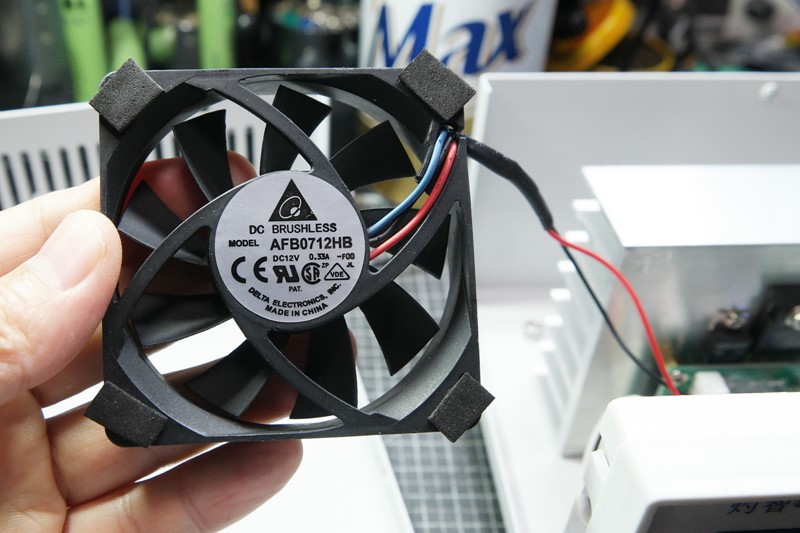 DC팬 0.33A를 소비하고 제법 소음이 있는 고속팬이다. 온도 센싱에 따라 속도가 달라지는지는 아직 테스트 해보지 못했고 혹시라도 유격으로 인한 잡음을 없애기 위해 스폰지 테입을 덧대어 주었다. 이게 바람소리뿐 아니라 덜덜거리는 소음도 있어 뽑기 실패인듯 싶다. 일단 스폰지 덕에 접촉소음은 거의 잡을 수 있었다.