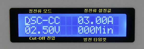 CC모드와 CP모드가 있고, 각각 정전류값과 정전력 값을 설정하게 된다. CutOff 전압에서 멈추고, 번외로 방전 시간을 설정할 수 있다.