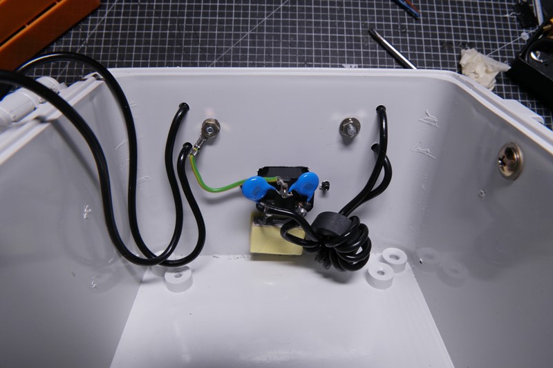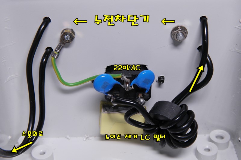 폐 컴퓨터파워의 입력부를 그대로 가져와서 케이블이 두꺼워진터라 페라이트 코어만 좀 더 큰 걸로 바꾸었다.