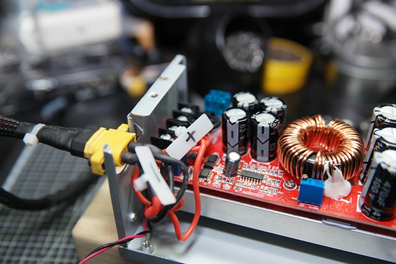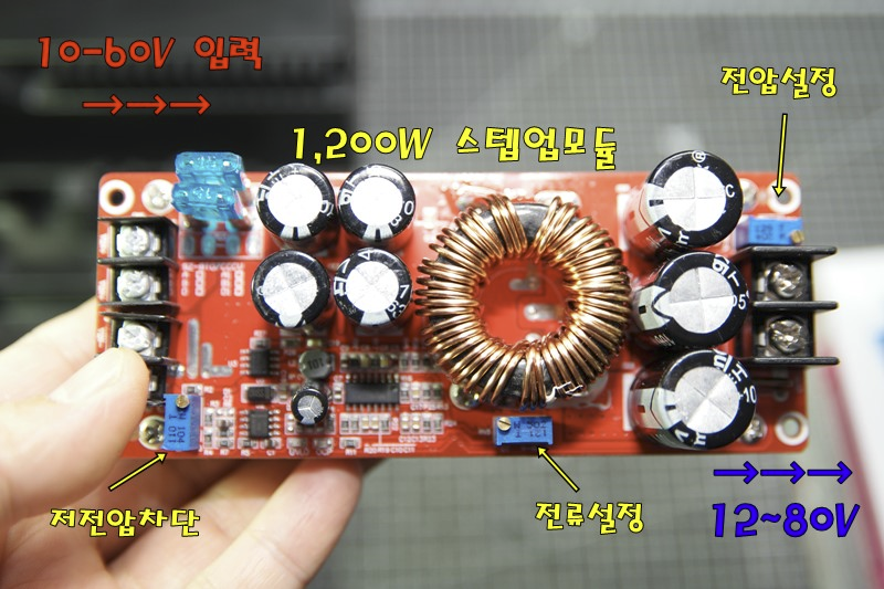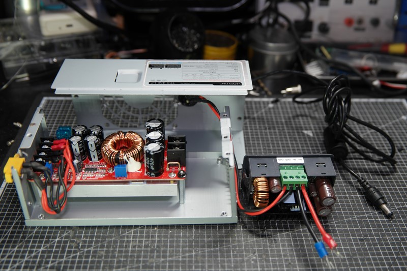 메인이 되는 준비물이다. 왼쪽이 DPS8005로 80V/5A 즉 400W 스텝다운 CC/CV 컨트롤러이고, 오른쪽이 1,200W 스텝업 모듈이다.