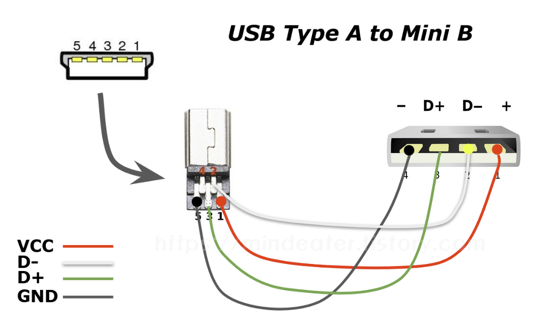 기존 USB 케이블에 mini B 잭 연결을 위한 배선도