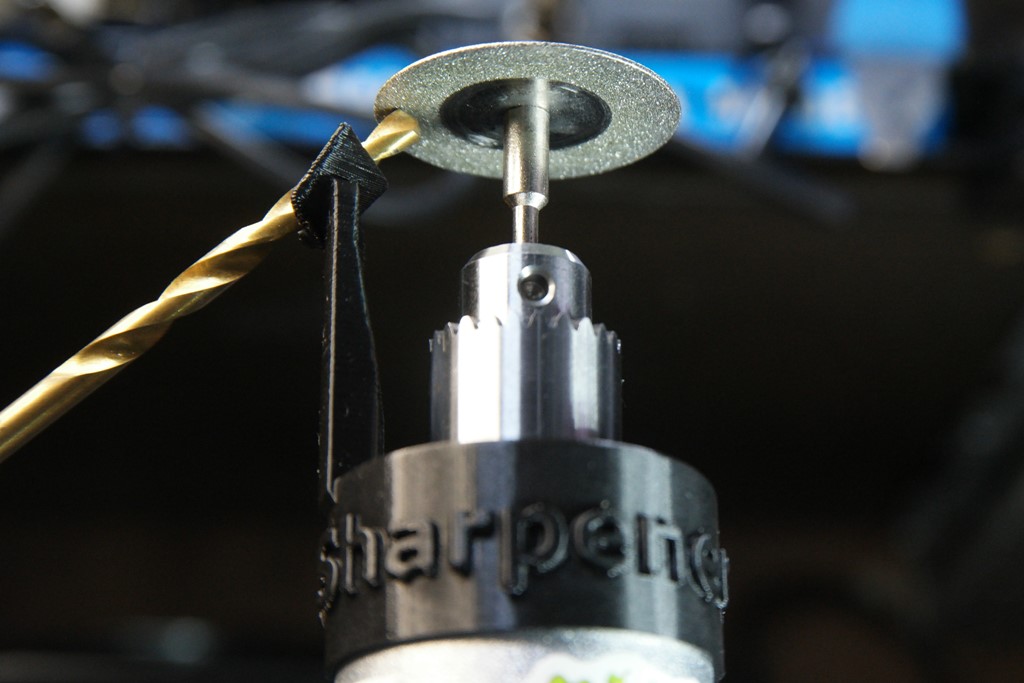 드릴 비트를 드레멜용 다이아몬드 휠 아래에 45도로 연마할 수 있도록 했다.