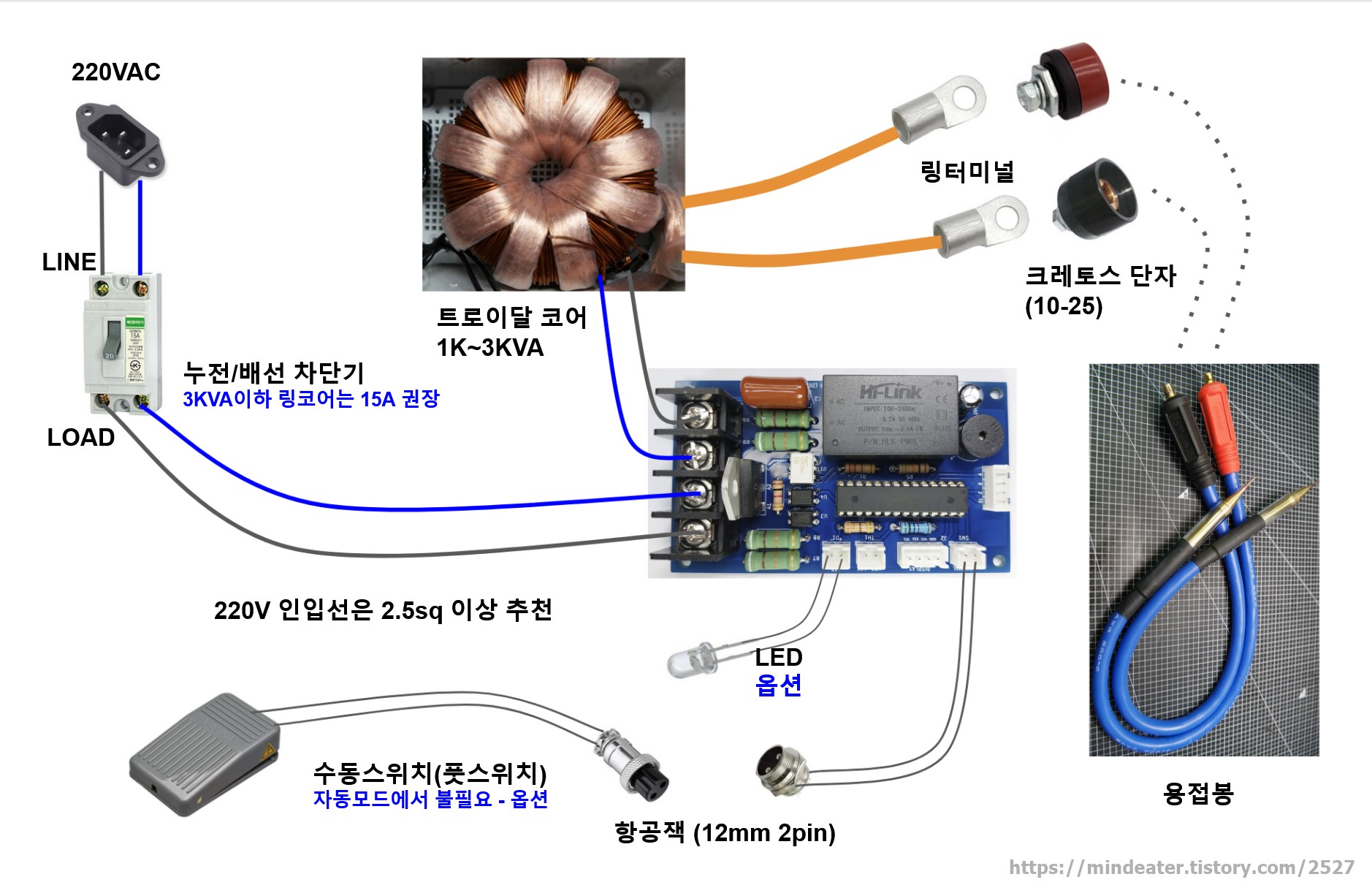 | 용접동봉 https://cafe.naver.com/hssoon/210082 홍공주아빠님 용접동봉(현재 가장 고퀄리티) 분양품 혹은 혹은 드릴척과 크롬동봉을 이용하여 자체제작 간혹 몇 셋씩 구비하고 있을때가 있는데 문의주세요. 크레토스셋 https://smartstore.naver.com/atdiy/products/456975739 https://smartstore.naver.com/atdiy/products/456973274 %% 정품을 사용하세요. (손잡이에 cretos 마킹) %% 가품은 결합이 정교하지 못하여 성능저하가 발생합니다. %% https://mindeater.tistory.com/2575 (정품 vs 가품) 실리콘 용접선 (4awg 1m 추천) https://smartstore.naver.com/woori-papa/products/5374996940 >> 적어도 4awg를 사용하고 여유가 되면 2awg 추천 2차 권선 https://smartstore.naver.com/nlighting/products/5958499676 가격 유동폭이 큽니다. 오픈마켓에서 KIV 25SQ, KIV 35SQ, KIV 50SQ 으로 검색하셔서 적절한 판매처를 선택하시는 것이 좋습니다. 압착터미널/링터미널 전선 두께에 맞추어 구입하세요~ 압착터미널로 검색하시면 쉽게 찾으실 수 있습니다. 보통 전선 판매처헤서 함께 구입가능합니다. 14파이 투명 수축튜브 (50sq까지 들어갑니다) http://itempage3.auction.co.kr/DetailView.aspx?ItemNo=B384810877&frm3=V2 > 15파이가 작업이 용이합니다. > 작업시 에어로 쏘면서 넣으면 쉽게 들어갑니다. 케이스 http://auction.kr/iBuilrz > 수지형 1.5K가 딱 맞게 들어가며 2K 이상은 이것보다 조금 더 커야합니다. > 가장 적은 사이즈 이니 이 보다 조금씩 큰걸 구입하시면 작업은 수월해집니다. 풋스위치+항공단자(옵션) - 수동모드시 필요 --> 간단한 리셋 스위치(눌렀다 떼면 떨어지는)로 대체 가능 https://smartstore.naver.com/2020goss/products/5171594880 https://homemadeclub.co.kr/product/detail.html?product_no=1917 |