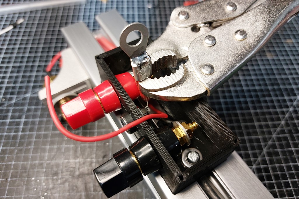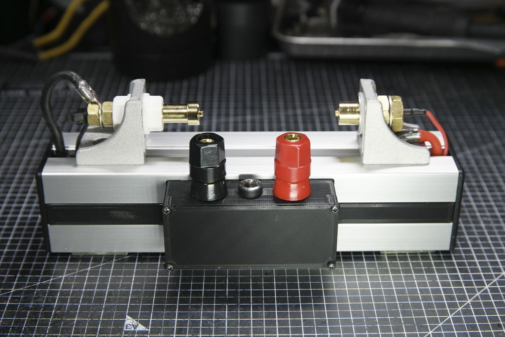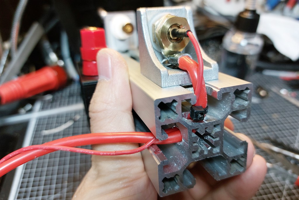프로파일 끝부분에 홀가공을 해서 옆으로 빼서 바나나잭에 연결하도록 수정했습니다. 포고핀은 30A 가능한 스펙이라 방전선은 12AWG를 사용했고 이 전선의 허용전류는 33A입니다. 실제 30A는 그렇고 20A 정도의 고방전 배터리를 빠르게 테스트 할 수 있을 듯 합니다.