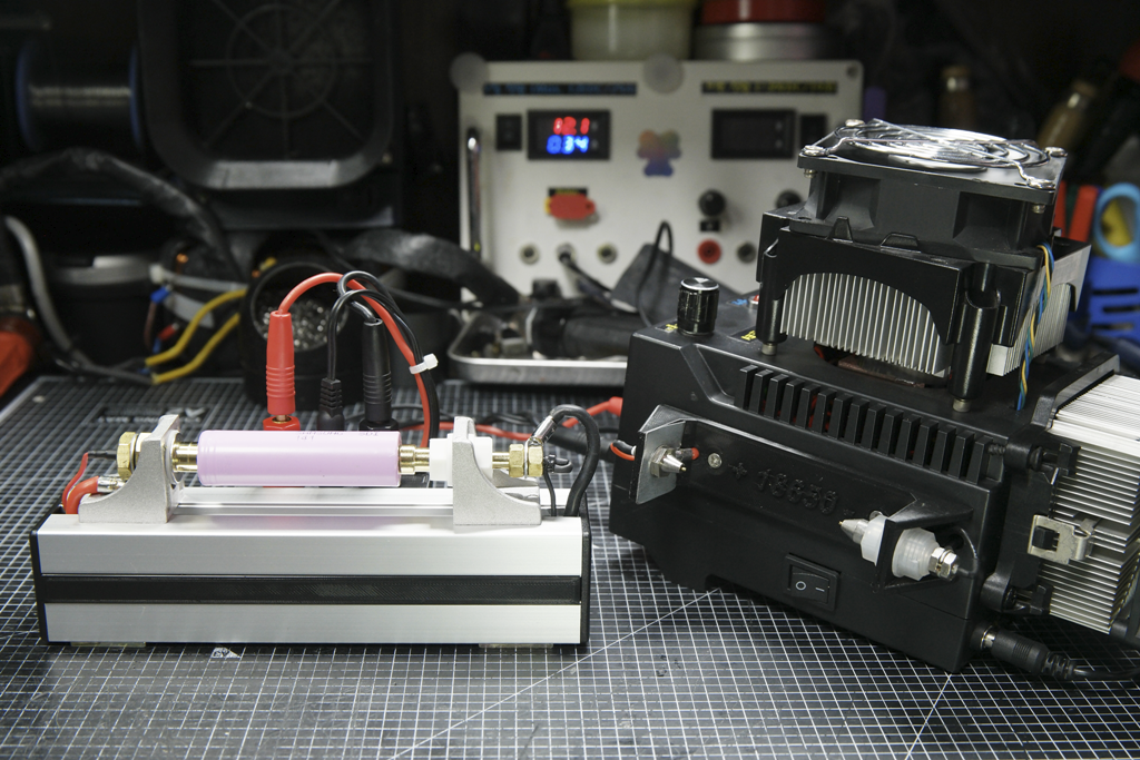 자작 방전기는 사진처럼 직접 포고핀을 3D로 지지대를 제작해서 사용중입니다. 플러스 단자에 플라스틱 가이드가 없어서 10A 방전시 열이 출력물에 전달되어 번형이 될것 같아 철판을 이용하여 분산시켰더니 그럭저럭 버텨줍니다.