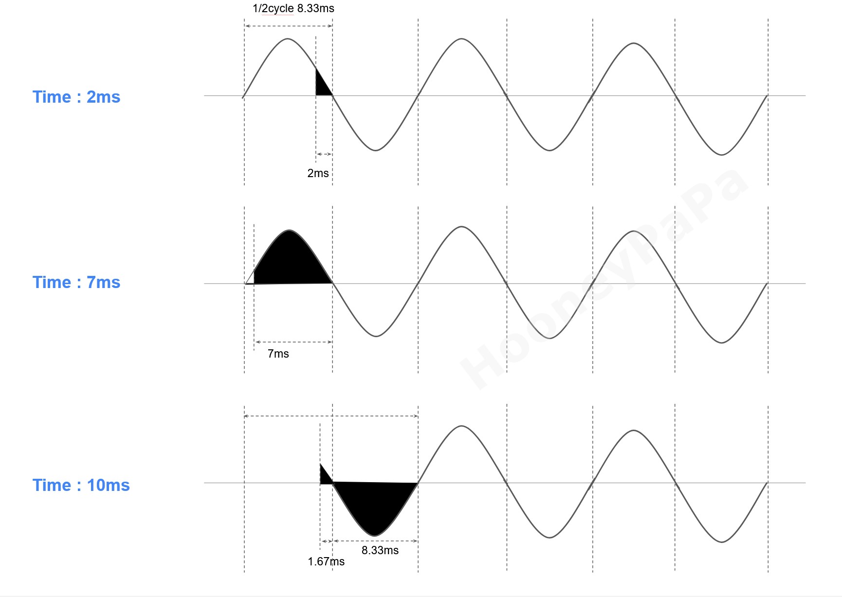 - 세 번째 스폿타임 10ms는 제로크로싱 포인트 1.67ms 앞에서 시작해 다음 반주기의 끝지점에서 종료