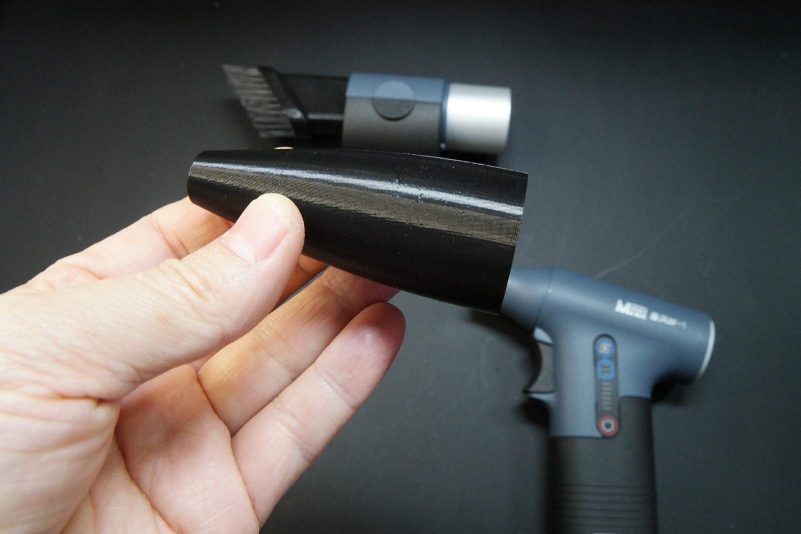 좁은 곳이나 튜브에 바람을 넣을 때 활용할 목적으로 후드가 있으면 좋을 듯 싶어 3D 디자인을 해주고 출력해서 장착해주었다. 집중효과는 있지만 풍량이 다소 줄어들고 대신 소음은 커진다.