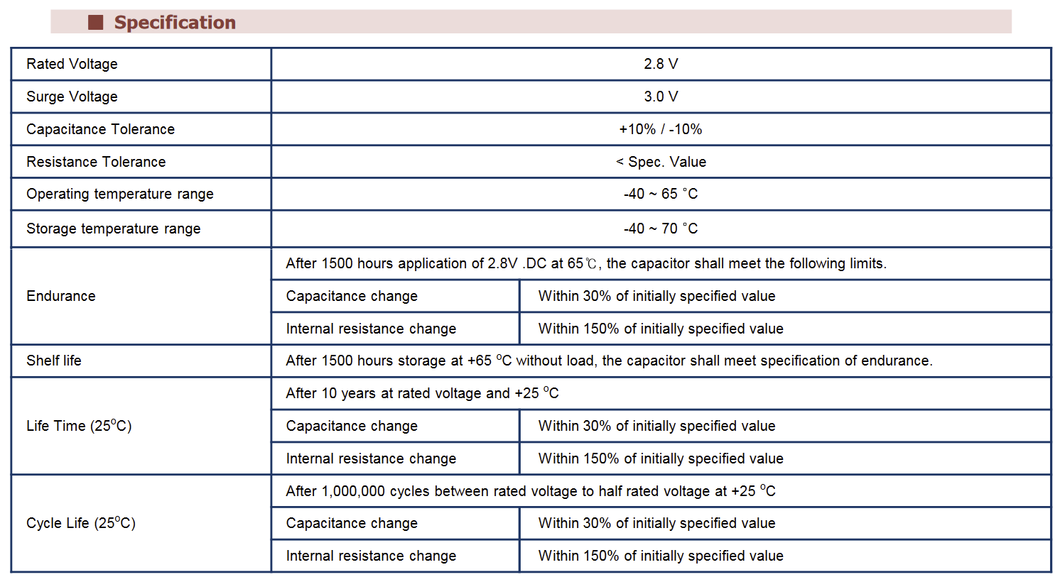 간단하게 설명하면, 용량 30%감소와 내부저항 150% 증가하면 수명이 다했다고 판단할때, 내구성과 제조사에서 성능/품질을 보증하는 기간인 Shelf life 는 섭씨 65도, 2.8V에서 1500시간이며, 수명(Life Time) 상온 25도에서 10년, Cycle Life는 1,000,000회입니다.