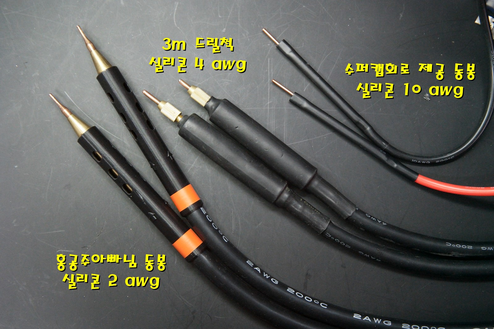 DC 방식 그 중에서도 방전량이 큰 수퍼 커패시터가 용접전원이다보니 힘은 좋습니다. 다만 수퍼커패시터가 스펙상 2000A까지 방전할 수 있고 회로의 모스펫도 이 전류량을 스위칭할 수 있는데 사용된 전선은 허용전류 140A 실리콘 10awg를 사용한다는 점입니다.