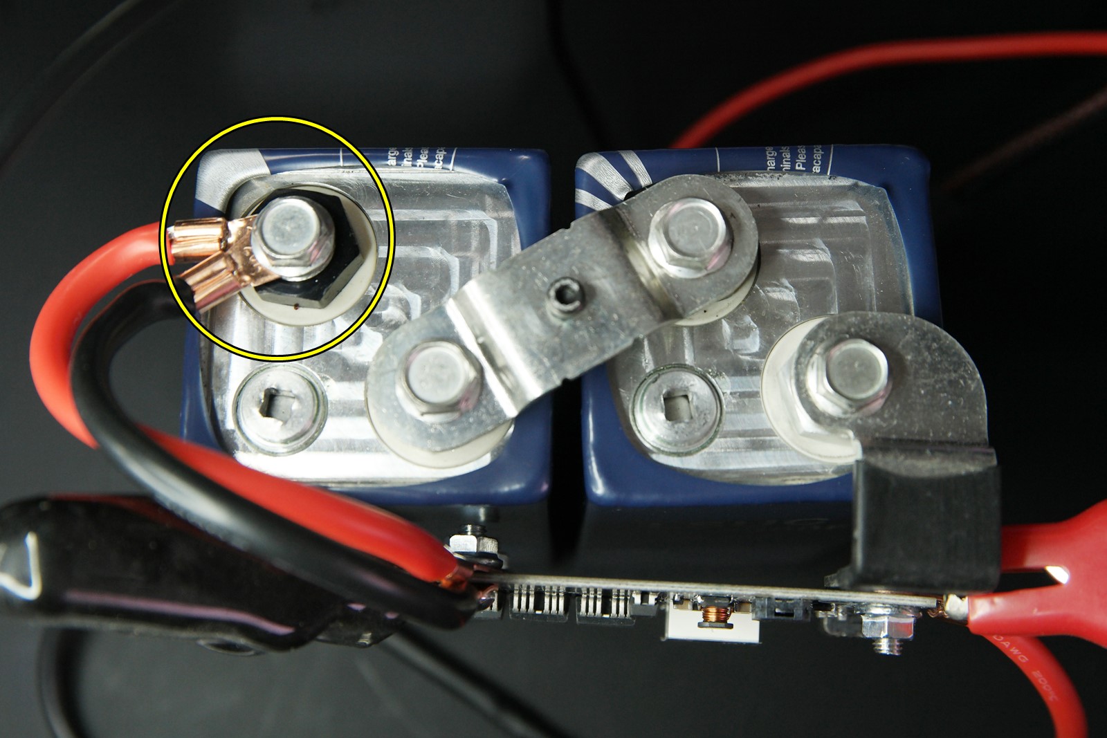 플러스는 용접봉과 직결이고 왼쪽 마이너스가 모스펫을 이용하여 스위칭되는 구조입니다. 가 테스트를 위하여 커패시터를 2S로 연결한 다음 사진처럼 회로를 연결했습니다. 이렇게 간단하게 나사만 체결하고 커패시터를 충전하면 스폿은 가능하니 확실히 초보분들 접근성은 낮아진 듯 합니다. 물론 안전 수칙과 충방전 관련하여 공부는 조금 하셔야 합니다.