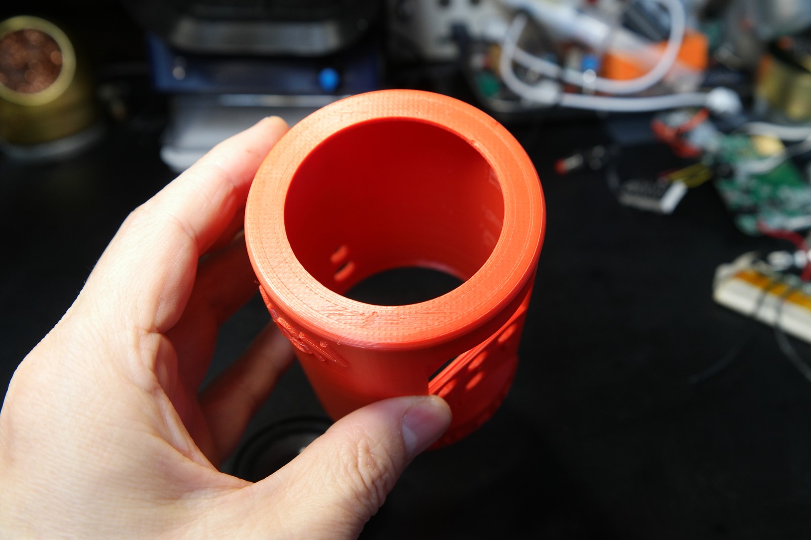 나사를 사용하기 싫어 원통형으로 디자인했고, 밑판은 나사산을 내서 돌려서 고정하도록 했습니다.