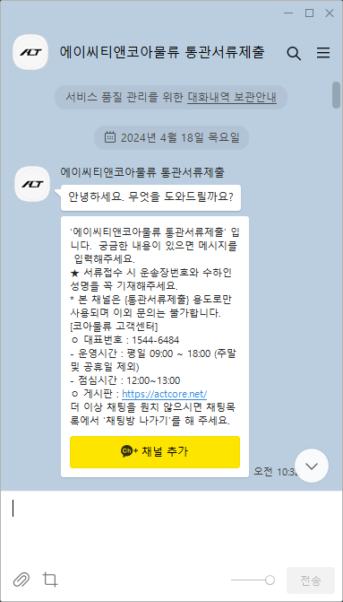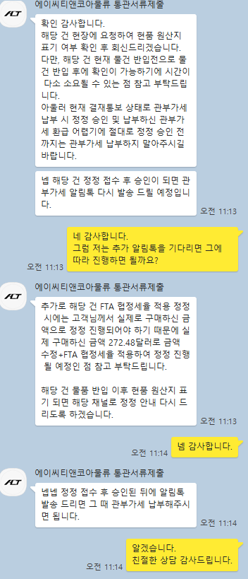 관부가세 정정접수는 관세청 문의 이후 에이티시코아물류에 각각 상담을 통해 최종적으로 에이티시앤코아물로 통관서류제출 카카오톡채널을 통해 진행했습니다.