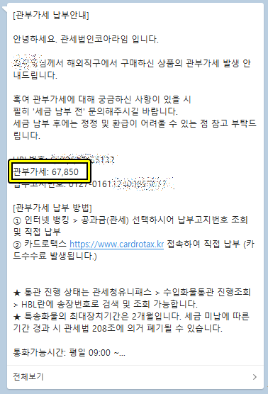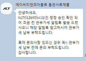 한 시간쯤 지나니 에이시티엔코압물류 통관서류제출 체널과 관부가세 납부 안내 톡이 톡이 왔습니다.