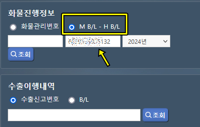 화물진행정보에서 M B/L - H B/L 항목을 체크하면 가운데 빈칸이 추가되고 거기에 알리익스프레스에서 복사한 운송장번호를 입력하면 아래와 같이 진행과정이 나옵니다.