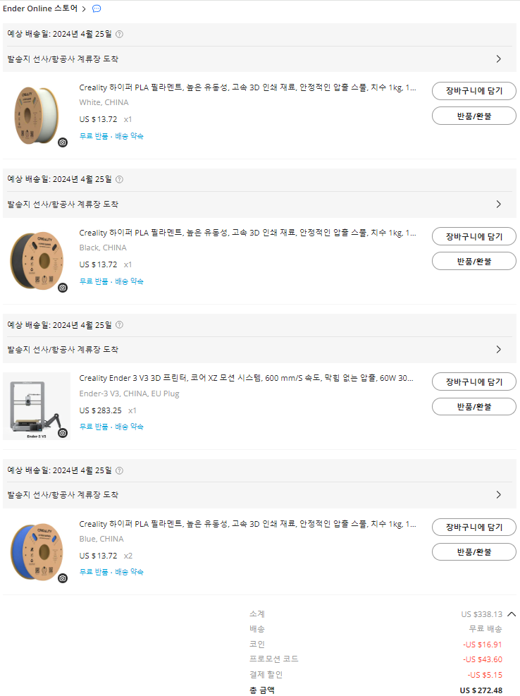 알리 프로모션에 따라 다르지만 이번 세일기간에는 카드사 할인이 하나카드 6%밖에 없어 조금 아쉽습니다. 가장 큰 쿠폰 할인 50달러를 받기위해 메인 프린터 이외에 필라멘트 6개와 기타 부품들도 몇 개 추가해 368달러를 넘겨서 주문 했습니다.