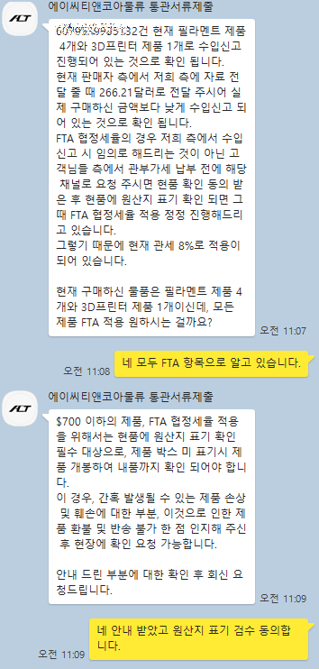 4월 24일 대행사에서 택배 상자를 개봉하여 원산지 표기인 "MADE IN CHINA"를 확인 FTA 한중협정 세율 항목 확인이 되었고 정정 진행한다고 톡이 왔습니다.