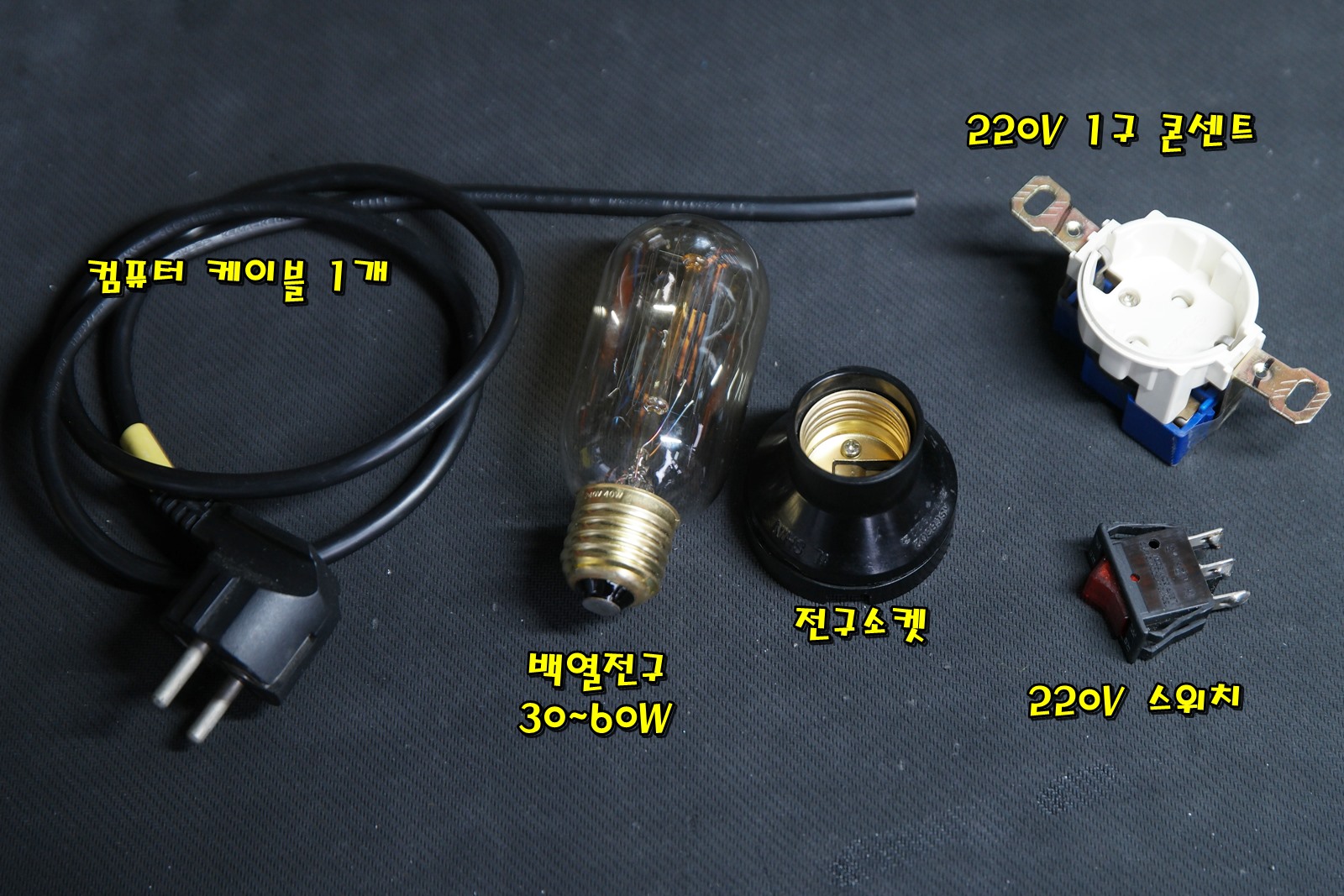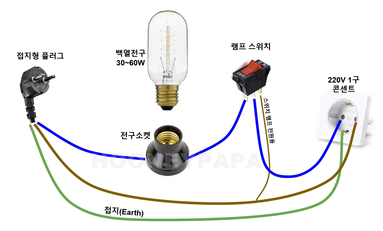 그림으로 보면 복잡해보이지만 백열전구를 220V에 단다는 가정에서 한 선을 잘라 콘센트만 연결해주는 됩니다.
