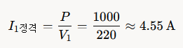 1차측은 정격 4.55A, 단락시는 90.9A
