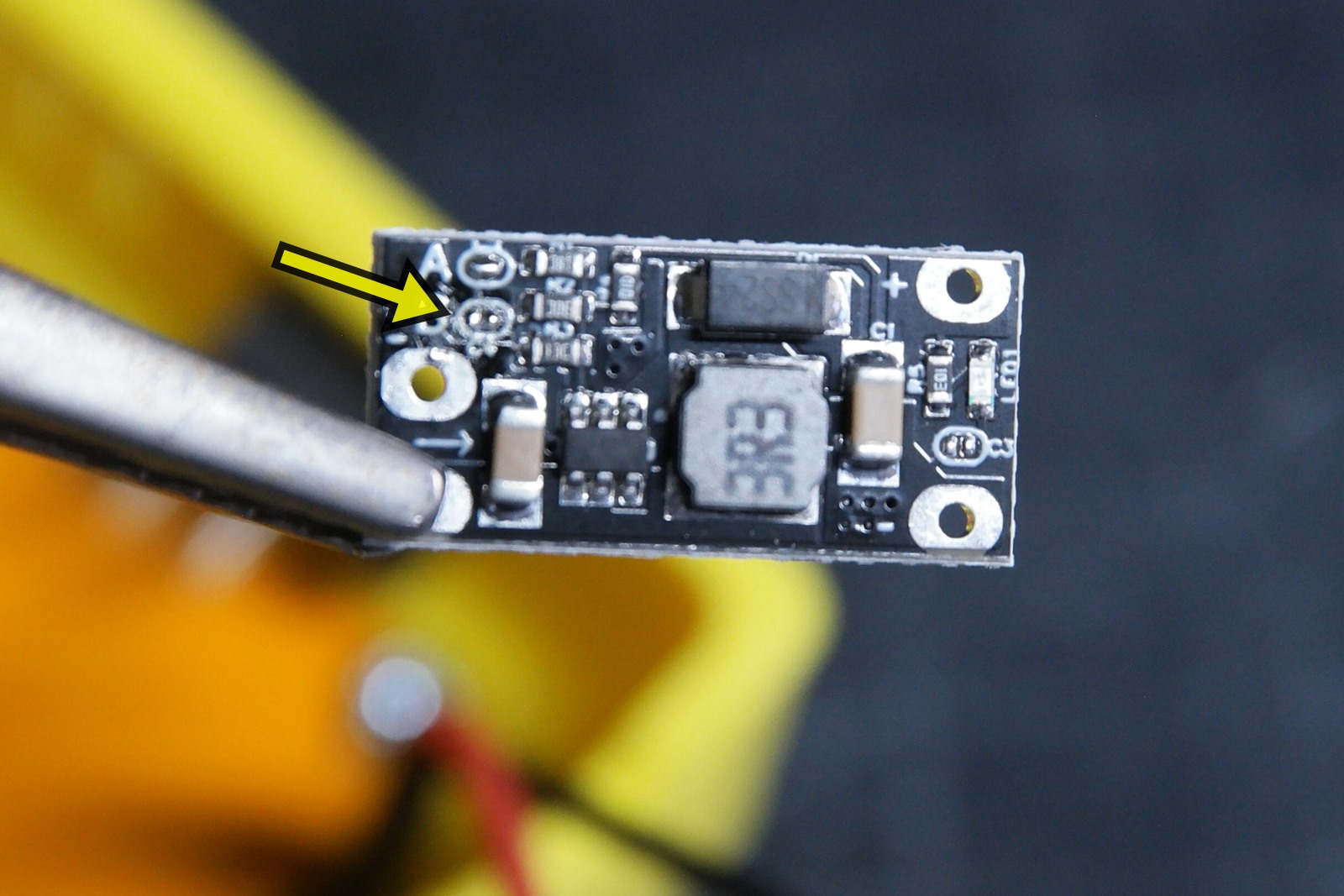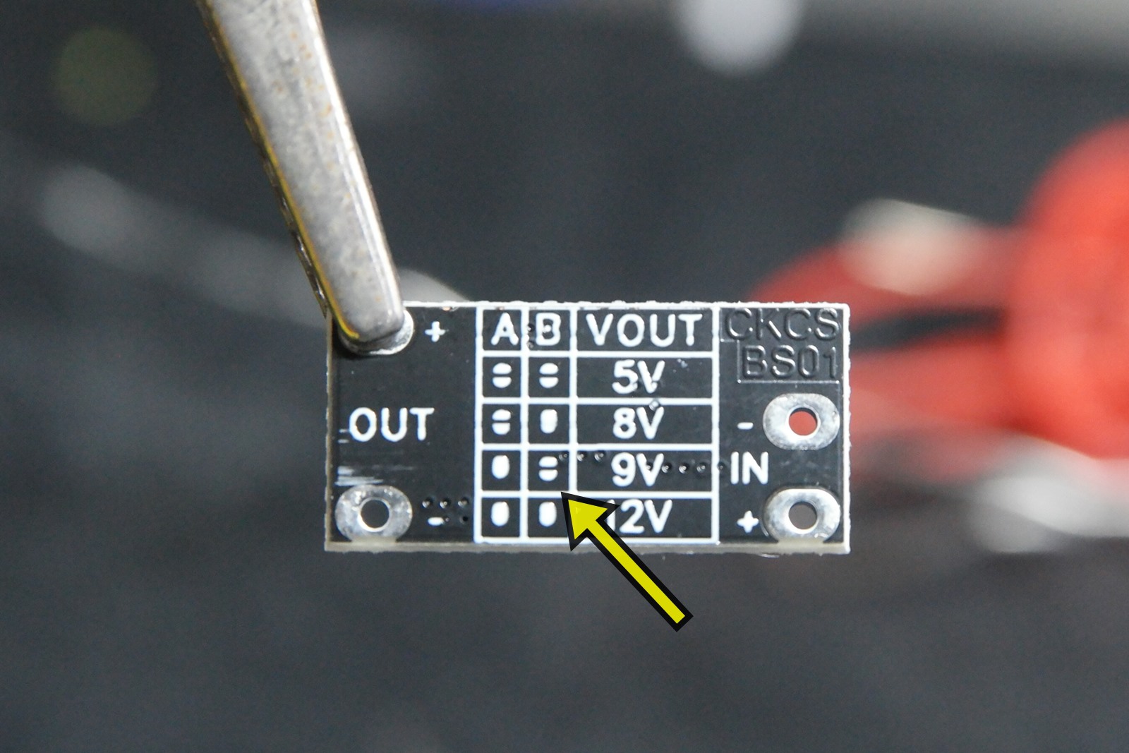 미니 스텝업 모듈인데 A 핀은 그대로 놔두고 B마킹된 곳의 납을 제거해서 분리해 9V 출력으로 설정합니다.